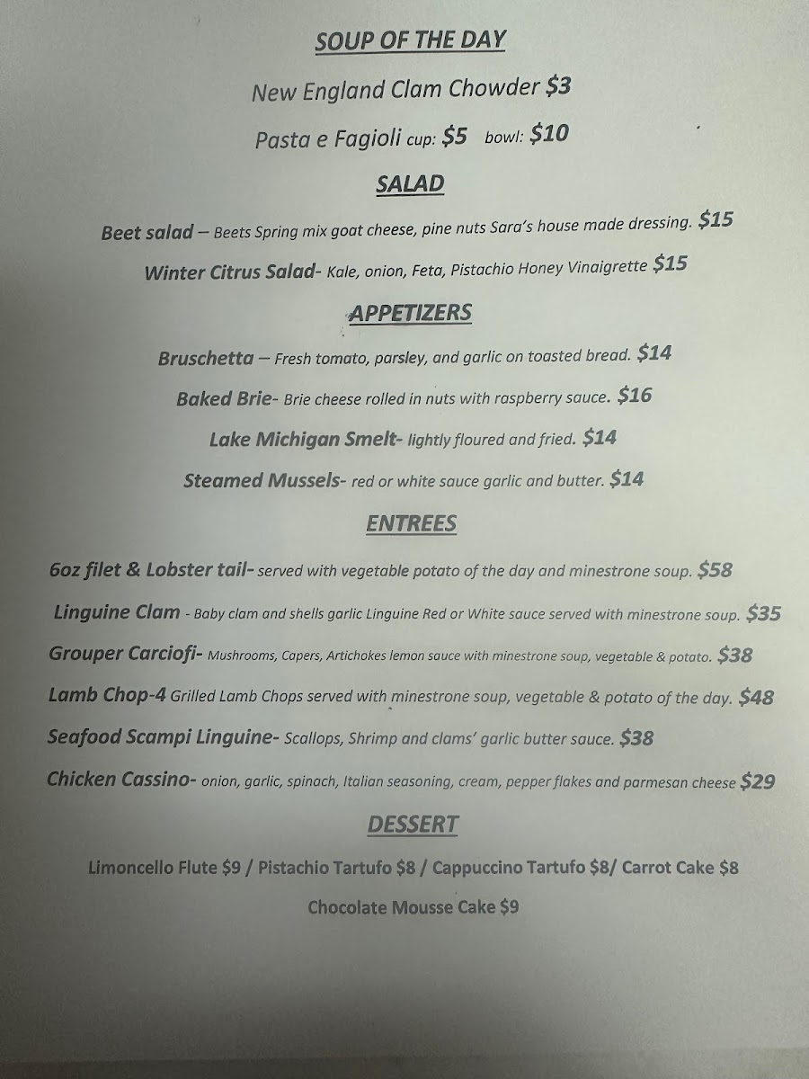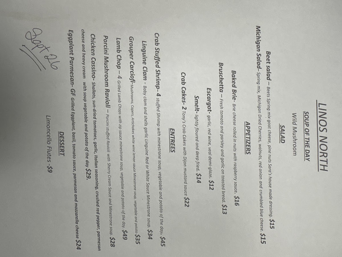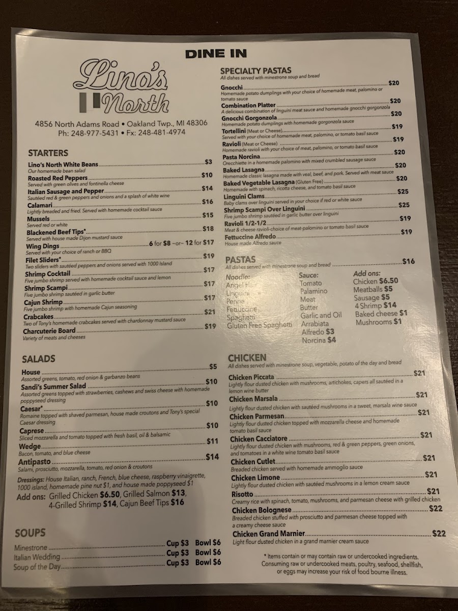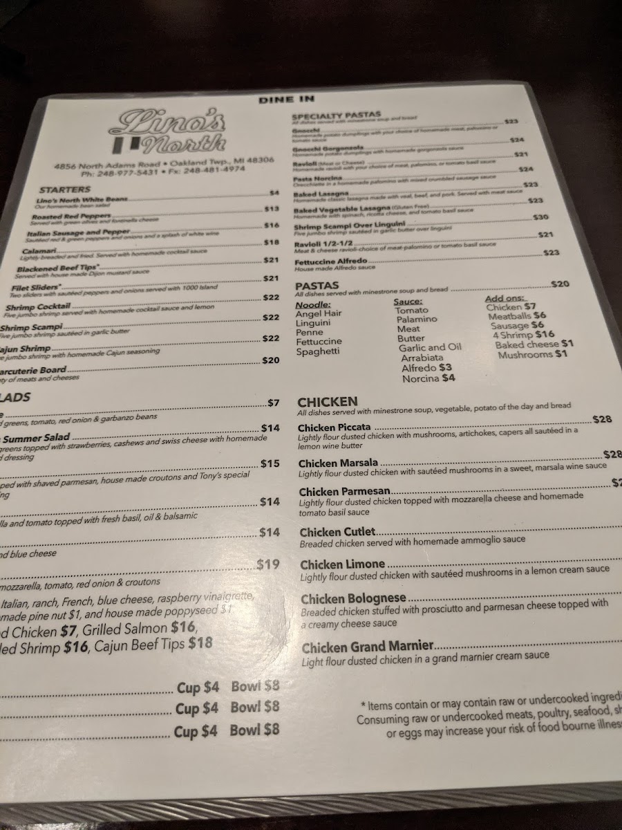 All dishes are served with bread • Noodle:- Angel Hair- Linguini- Penne- Fettuccine- Spaghetti• Sauce:- Tomato- Palamino- Meat- Butter- Garlic and Oil- Arrabiata- Alfredo +$5.00- Norcina +$5.00• Add-ons:- 1 Pc. Chicken +$4.00- 2 Pc. Chicken +$8.00- Meatballs +$8.00- Sausage +$8.00- 4-Shrimp +$18.00- Baked Cheese +$1.00- Mushrooms +$1.00